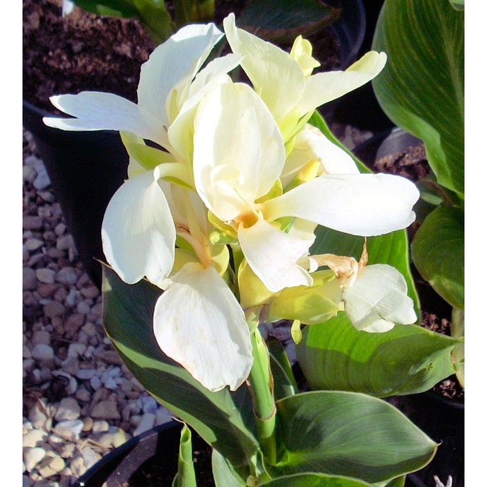 Корневище канны Амбассадор (Ambassadour) – это уникальный сорт, который привлекает внимание своей редкой белоснежной окраской. Высота растения достигает 90 см, а его крупные, эллиптические листья имеют насыщенный зеленый цвет. Цветы кремово-белого оттенка, диаметром 10-12 см, собраны в изящные соцветия-метелочки. Цветение начинается в мае и продолжается до осени, создавая великолепное зрелище, когда бутоны постепенно раскрываются снизу вверх.